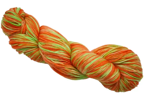 Entdecke High Twist — handgefärbte (Socken)-Wolle im fröhlich hellem Oange und Maigrün.
