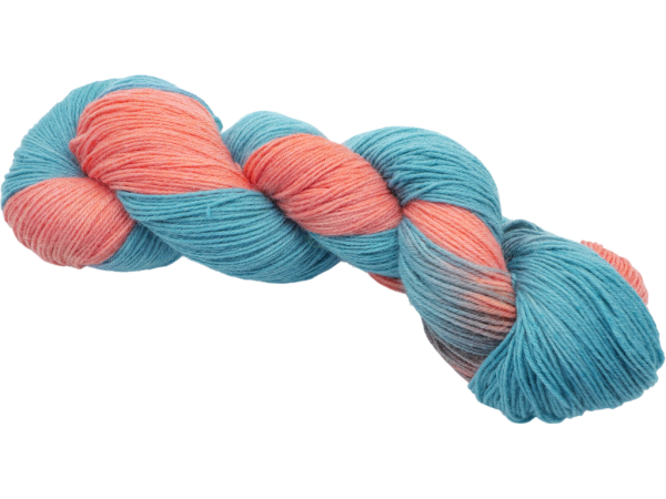 Jeder 100g‑Strang ist ein Unikat mit individuellen Farbübergängen und rund 420 Metern Lauflänge — ergiebig genug, dass ein Strang je nach Schaftlänge oft für ein Paar Socken bis Größe 46 reicht.