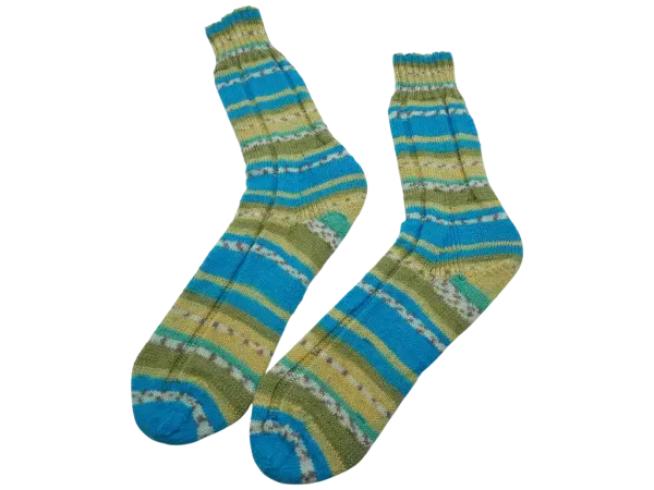 Handgestrickte Herrensocken – Türkisblau-Grün-Beige, Größe 49–50